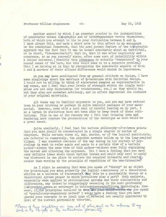 Letter from Brunswik to William Stephenson, May 26, 1952
